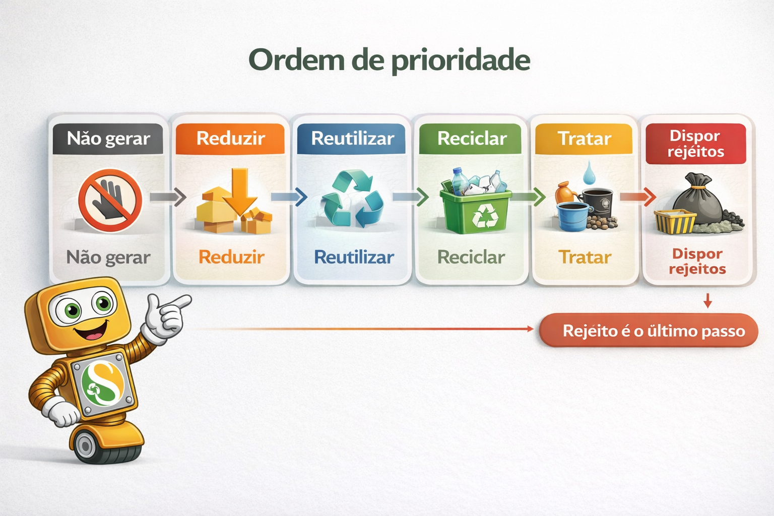 O coração operacional da PNRS está na ordem de prioridade. A gestão e o gerenciamento de resíduos devem observar a seguinte lógica: não geração, redução, reutilização, reciclagem, tratamento e, por último, disposição final ambientalmente adequada dos rejeitos.