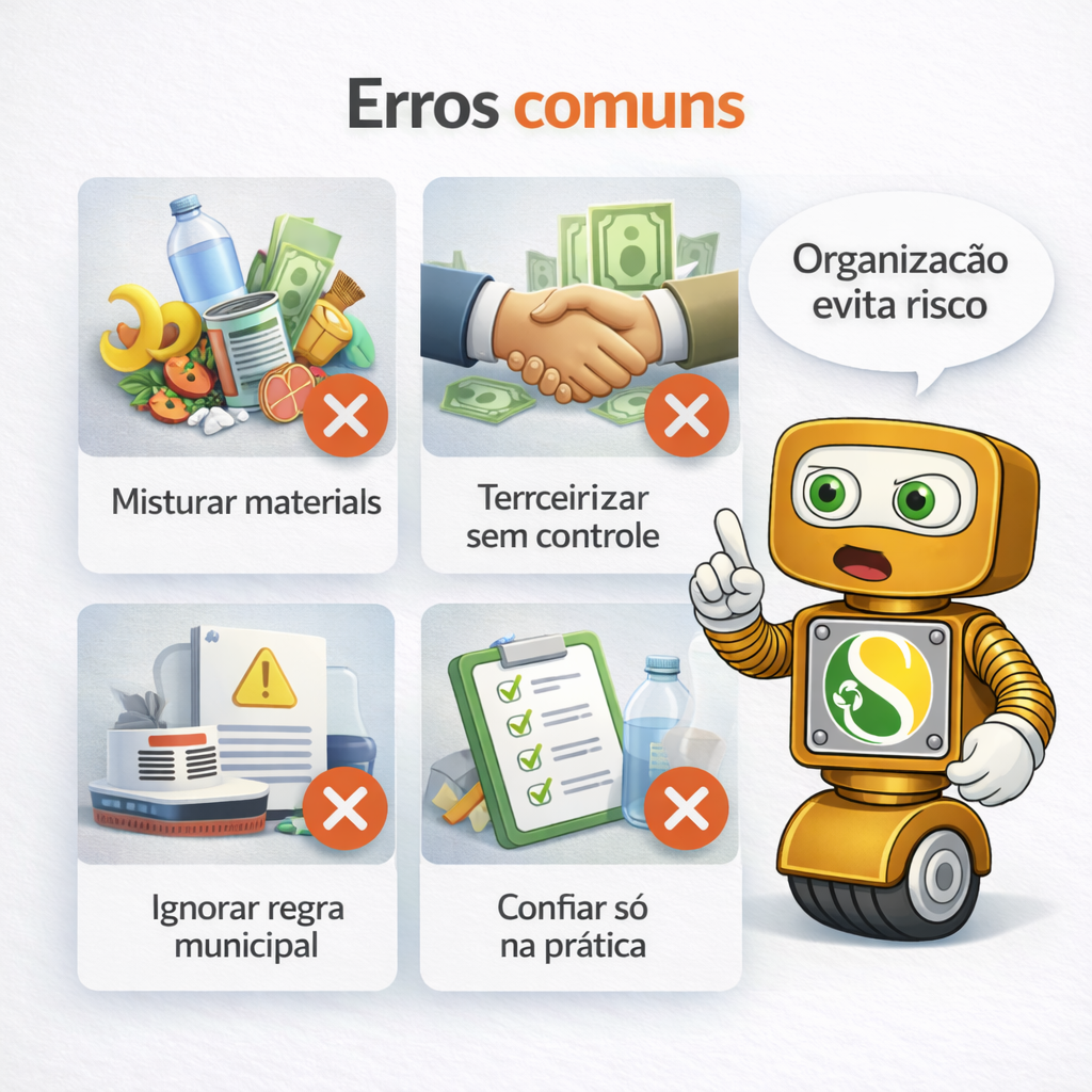 Um erro clássico é tratar todo material descartado como se tivesse o mesmo enquadramento. Misturar resíduo reciclável, rejeito, resíduo perigoso, sucata limpa e material contaminado costuma gerar erro de destinação, erro de contrato e erro de licenciamento.