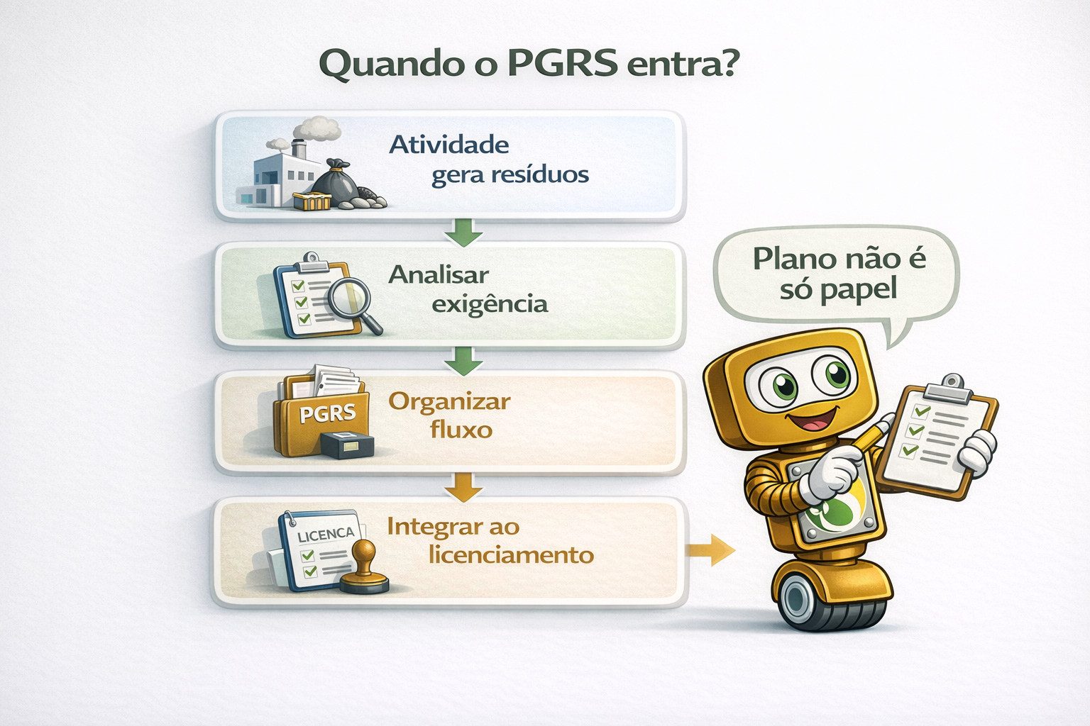 O ponto crítico é que o PGRS não é mero papel burocrático para “ter na pasta”. A própria PNRS trata o plano de gerenciamento como parte integrante do processo de licenciamento ambiental do empreendimento ou atividade. Portanto, quando a atividade exige esse plano, ele se conecta com a regularidade ambiental da operação.