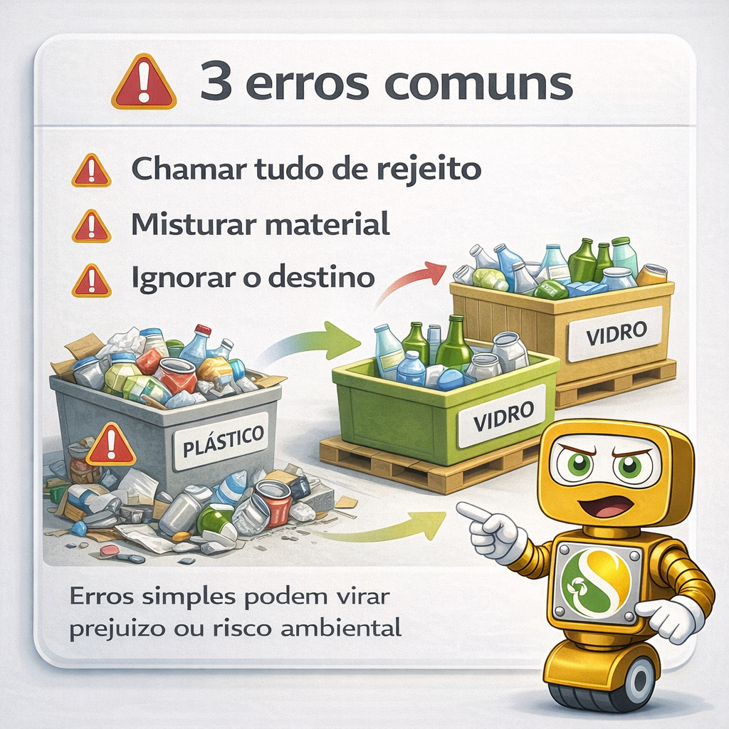 Misturar materiais incompatíveis, deixar resíduo exposto à chuva, perder identificação de origem ou armazenar sem critério pode derrubar valor comercial e ainda gerar risco ambiental.