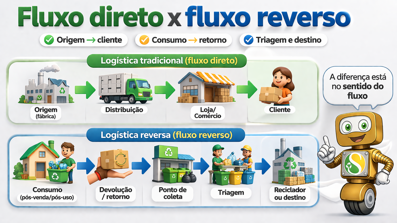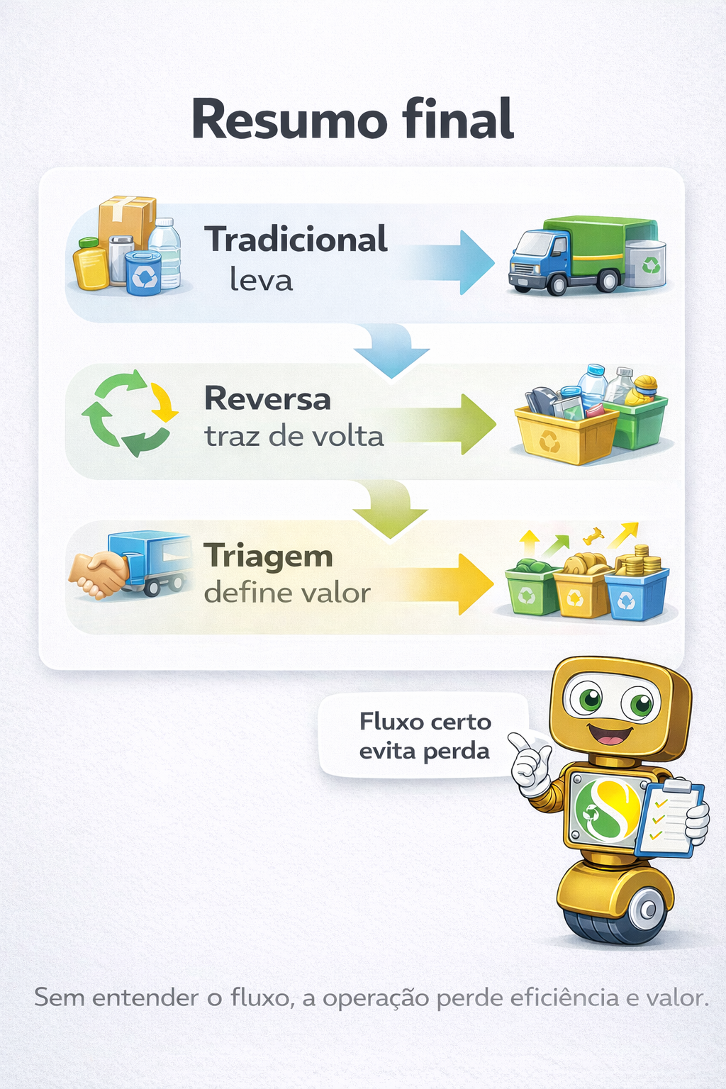 Quando a diferença entre os dois fluxos fica clara, fica mais fácil organizar coleta, venda, retorno e destino.