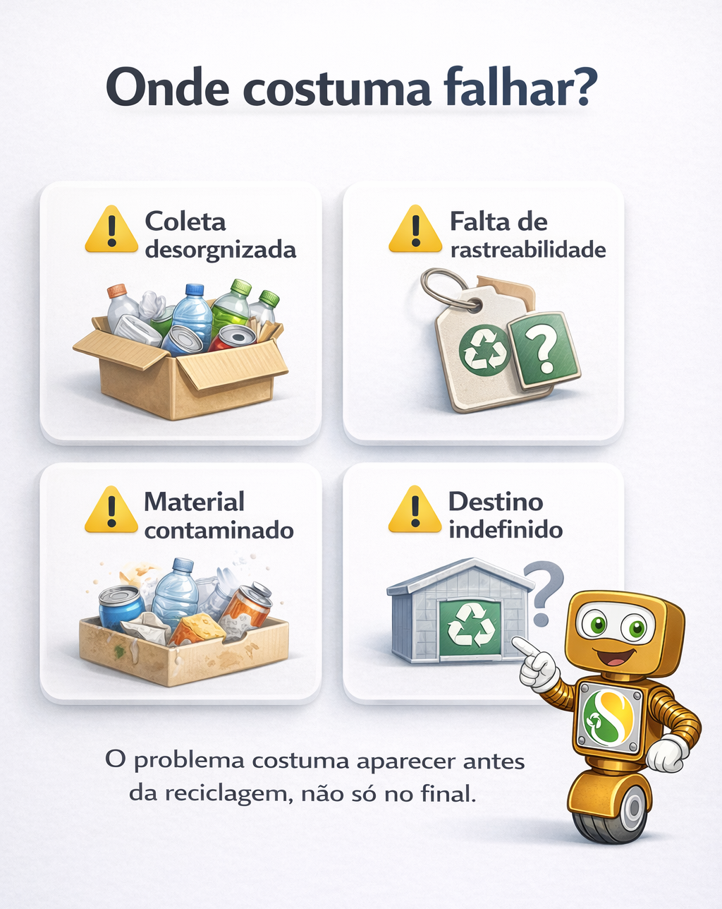 Quando embalagem, reciclável, rejeito e eletrônico são misturados, o custo da triagem sobe e a recuperação de valor cai.