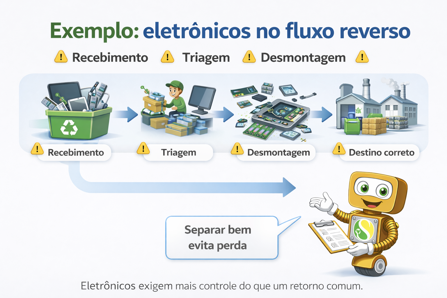 Nos eletrônicos, a logística reversa costuma ser mais sensível porque mistura valor econômico, risco operacional e cuidado ambiental.