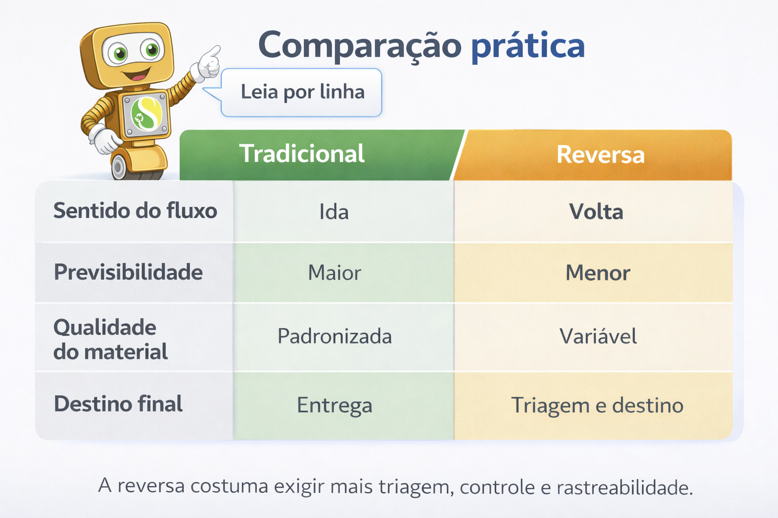 A comparação correta é esta: a logística tradicional leva algo com padrão mais conhecido; a reversa recebe algo que volta com mais variação e exige decisão sobre aproveitamento.