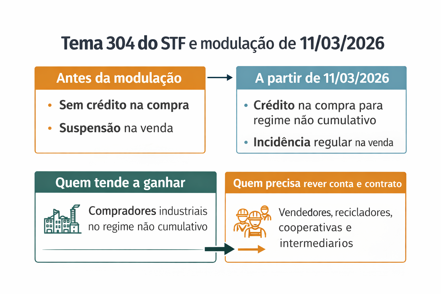 Esse desenho é relevante porque derruba uma leitura simplista que circulou em parte do mercado: a de que o STF teria simplesmente “beneficiado a reciclagem”. Não é isso. O novo quadro favorece a apropriação de crédito em uma ponta, mas recoloca a tributação na saída em outra. O efeito líquido depende da posição de cada agente na cadeia, do regime tributário da empresa e da forma como preço e contrato serão renegociados.