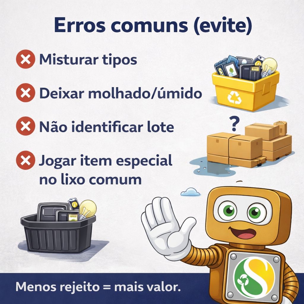 · Não é “misturar tudo e mandar para alguém separar”. Mistura aumenta contaminação e derruba valor.