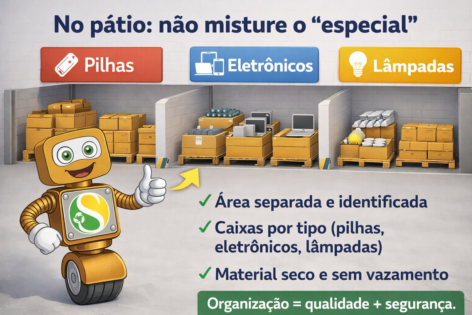 “Especial” não pode ir no “comum”. Pilhas, lâmpadas e eletrônicos misturados viram risco, derrubam a qualidade e podem gerar descarte irregular.