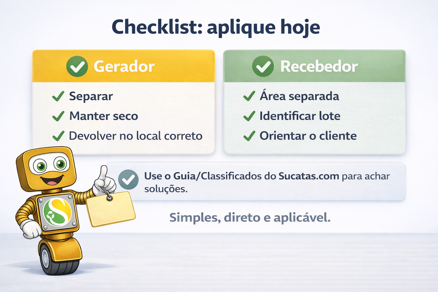 Mistura é o “inimigo do valor”. O mesmo vale para umidade, óleo e sujeira. Separar por tipo e manter seco é o caminho mais curto para reduzir rejeito.