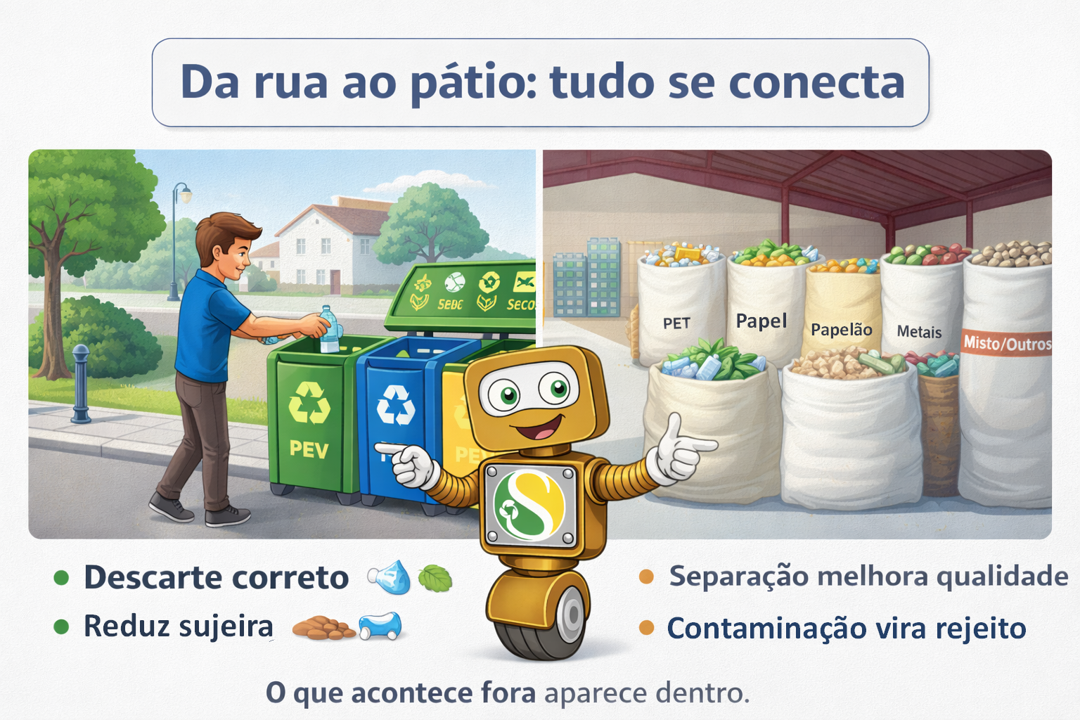 Se você atua (ou quer atuar) com sucatas e reciclagem, entender isso muda o jogo: o que acontece na rua (descarte, sujeira, contaminação) aparece no pátio (qualidade do lote, rejeito, custo e reputação).
