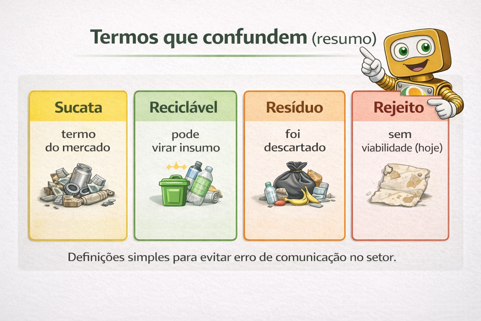 · Sucata é termo comercial (muito usado para metal). Reciclável é mais amplo. O que define é: existe comprador e viabilidade de reprocessamento para aquele material, naquela condição.