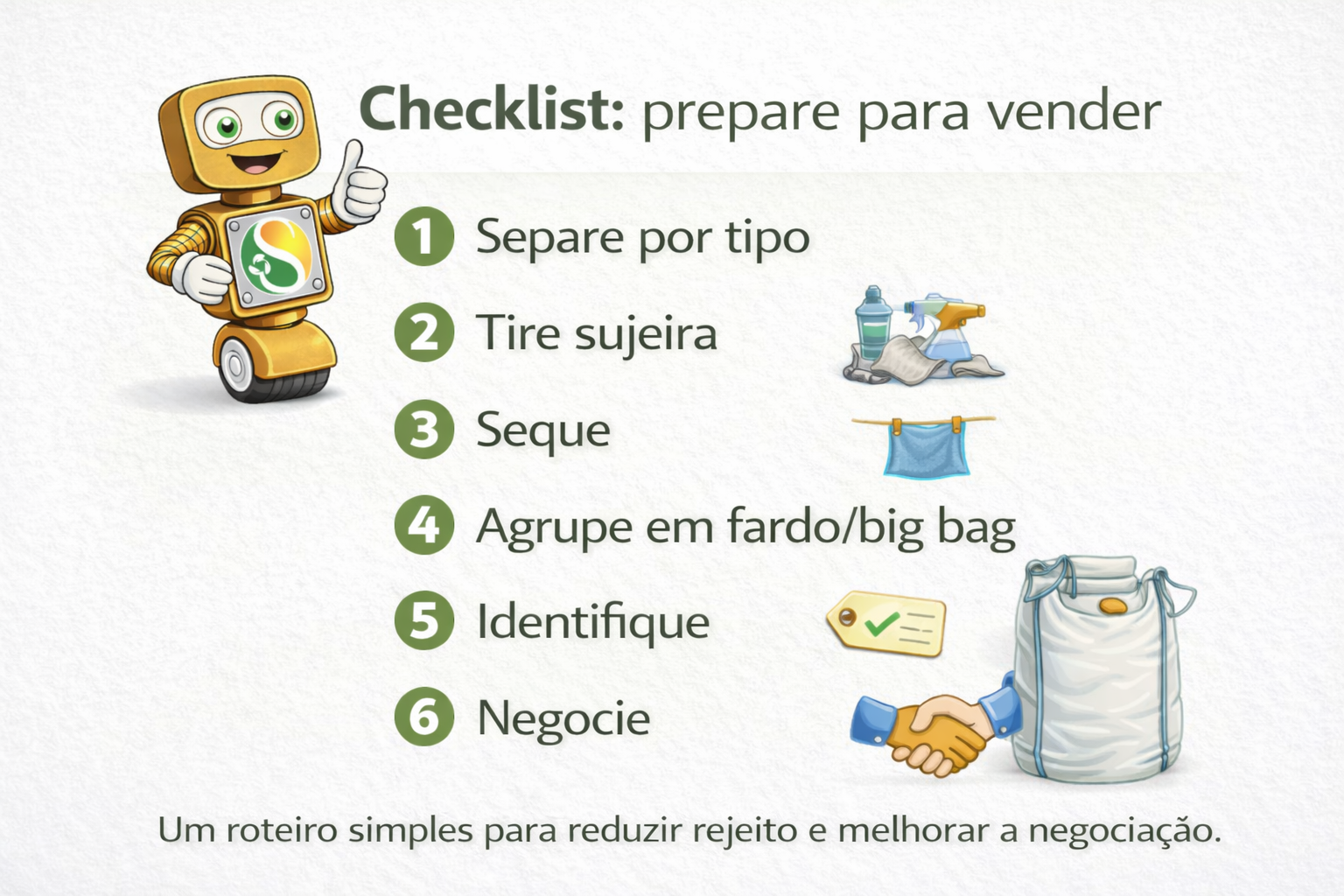 A venda ocorre por lote/carga/fardo. O comprador pode ser um pátio, uma cooperativa, um intermediário ou uma indústria recicladora. O caminho depende do volume e da qualidade.