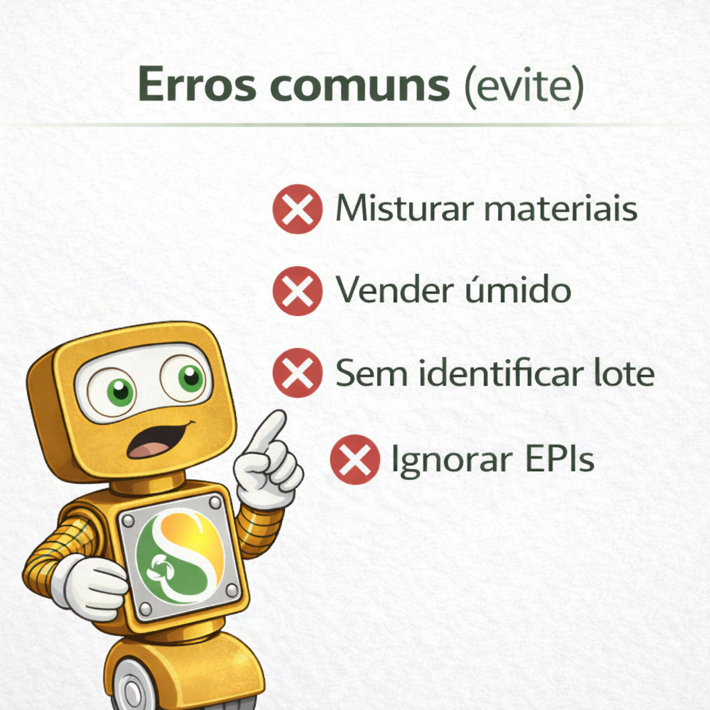 Aqui pesam muito: umidade, contaminação (comida/óleo) e mistura com outros materiais. Material seco e bem prensado/agrupado melhora logística e valor.