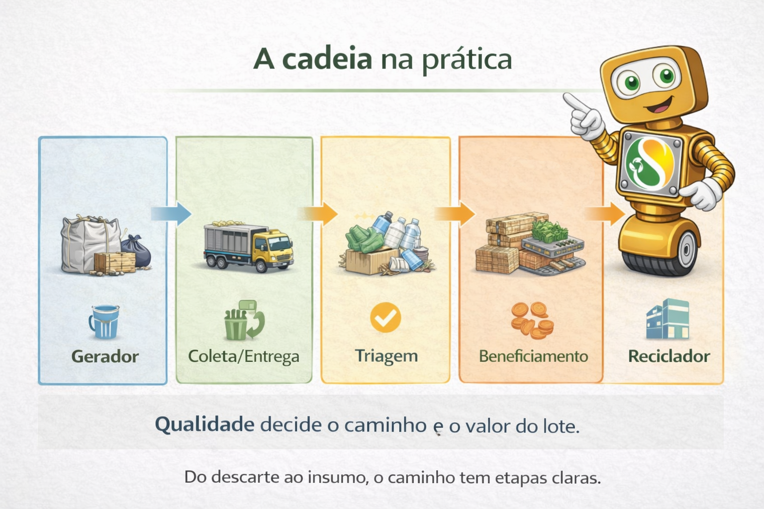 · Separação -> coleta/entrega -> triagem -> beneficiamento -> venda por lote -> compra por reciclador -> reprocessamento em insumo.