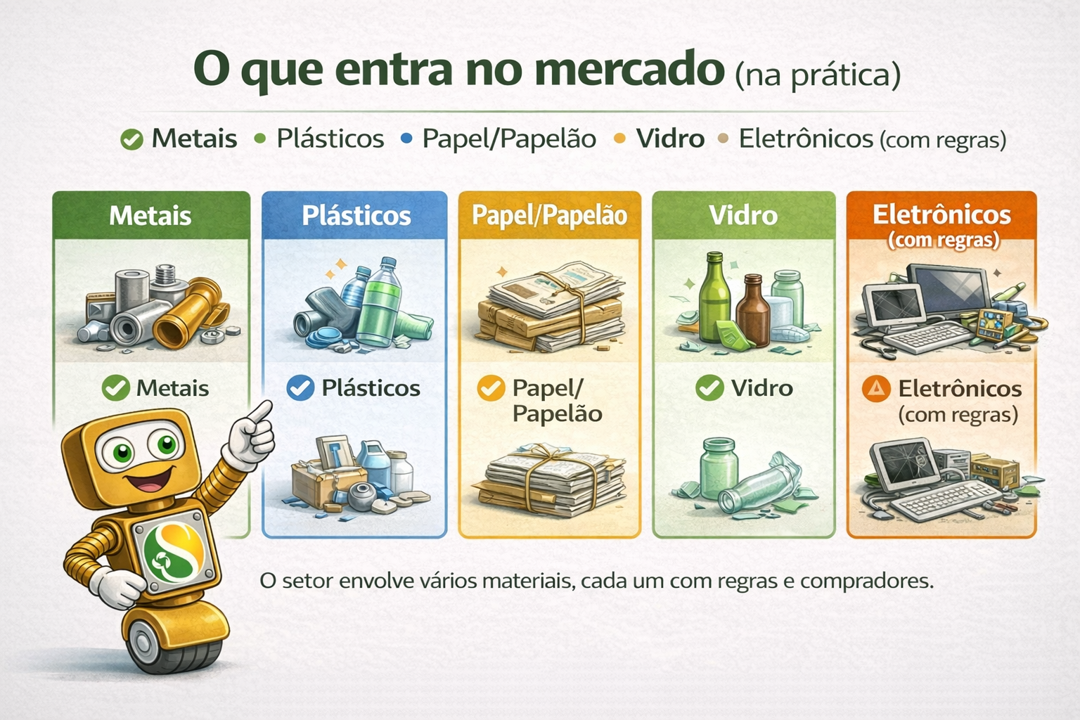 O mercado de sucatas e reciclagem, na prática, é o lugar onde material descartado vira matéria-prima de novo. Parece simples, mas tem uma diferença decisiva: não é "qualquer coisa jogada fora". Para entrar no mercado, o material precisa ter qualidade suficiente para ser separado, processado e comprado.
