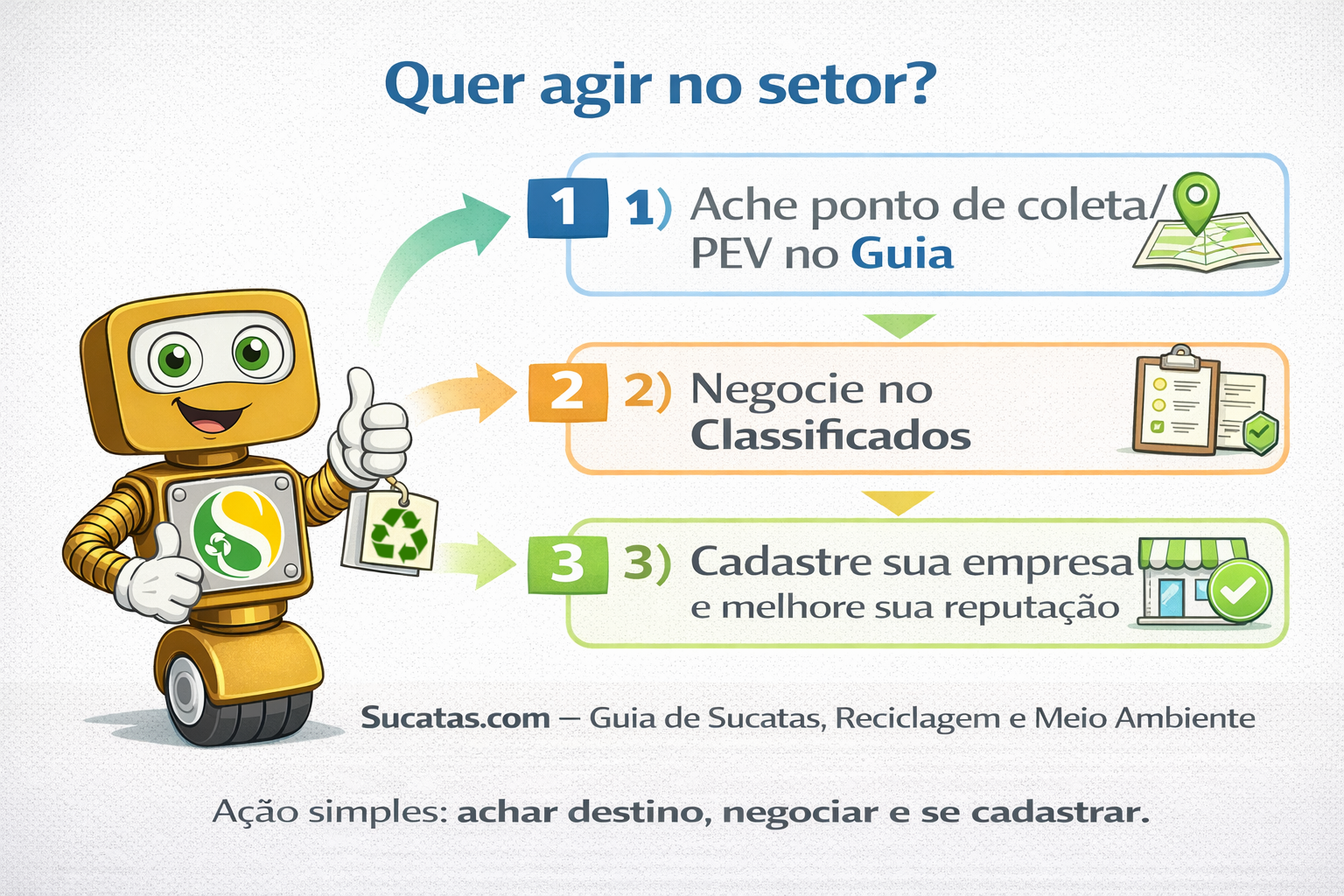 Você pode usar a coleta seletiva, cooperativas e pontos de coleta (PEV/ecopontos). No Sucatas.com, o Guia ajuda a localizar destinos e compradores.