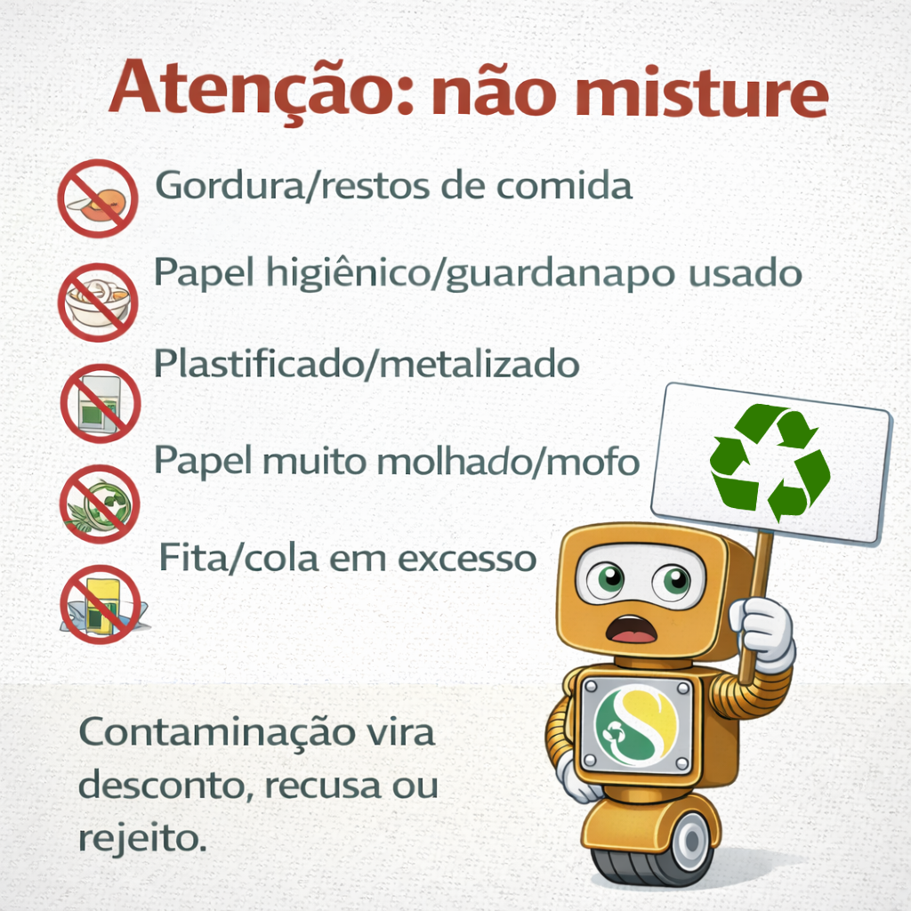 Alguns contaminantes são óbvios (restos de comida), outros passam batido (fita/cola em excesso, itens metalizados). A regra segura é: se for difícil de separar depois, não misture agora.