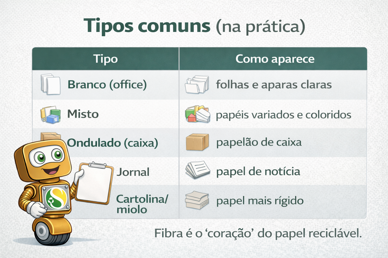 No setor, isso costuma virar ‘sucata de papel’ (também chamada de aparas) e é negociado por tipo e por qualidade. Você não precisa decorar todos os nomes do mercado: precisa separar o básico para não misturar materiais incompatíveis.