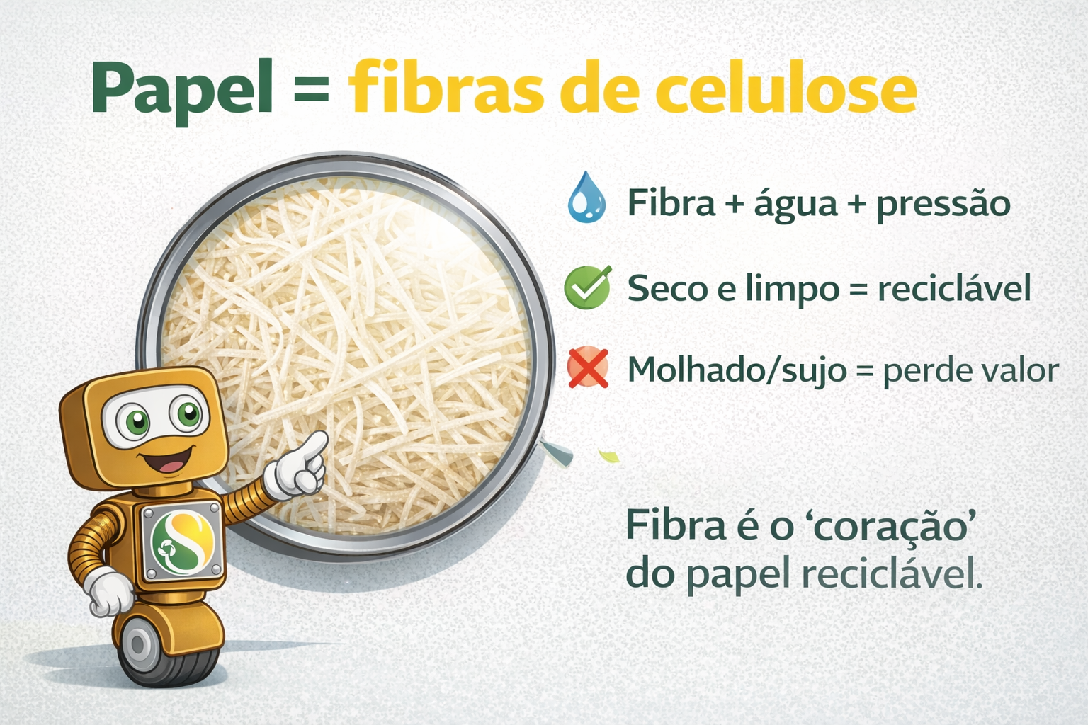 Celulose/fibra: Estrutura em “fios” que forma o papel; quando está limpa, vira matéria-prima de novo.