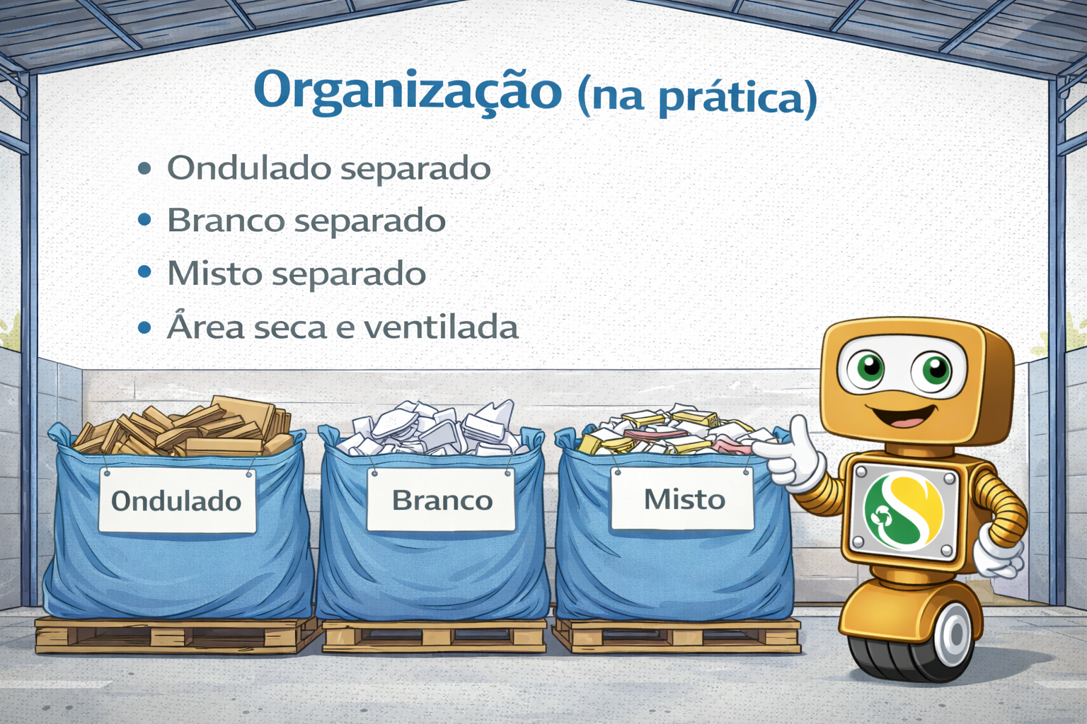 O objetivo é transformar um “monte de papel” em um lote previsível: separado por tipo, seco, sem sujeira e fácil de movimentar.