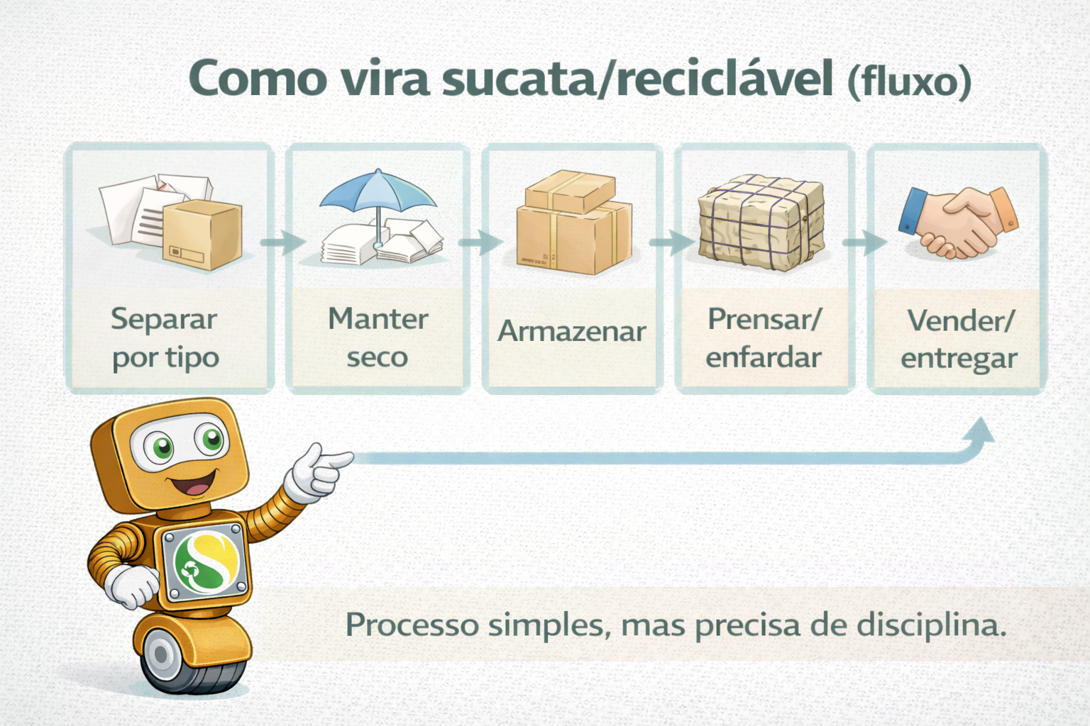 [Dica do Sucatinha] Etiqueta simples já resolve: tipo do material + data + origem (ex.: “Ondulado | 12/02 | Mercado X”). Isso ajuda a negociar e a controlar umidade/mofo.