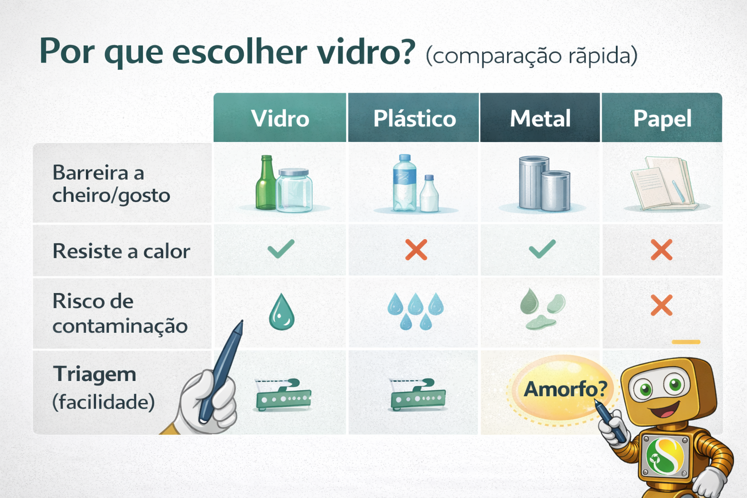 Comparar materiais ajuda a entender por que o vidro ainda é preferido em vários produtos.