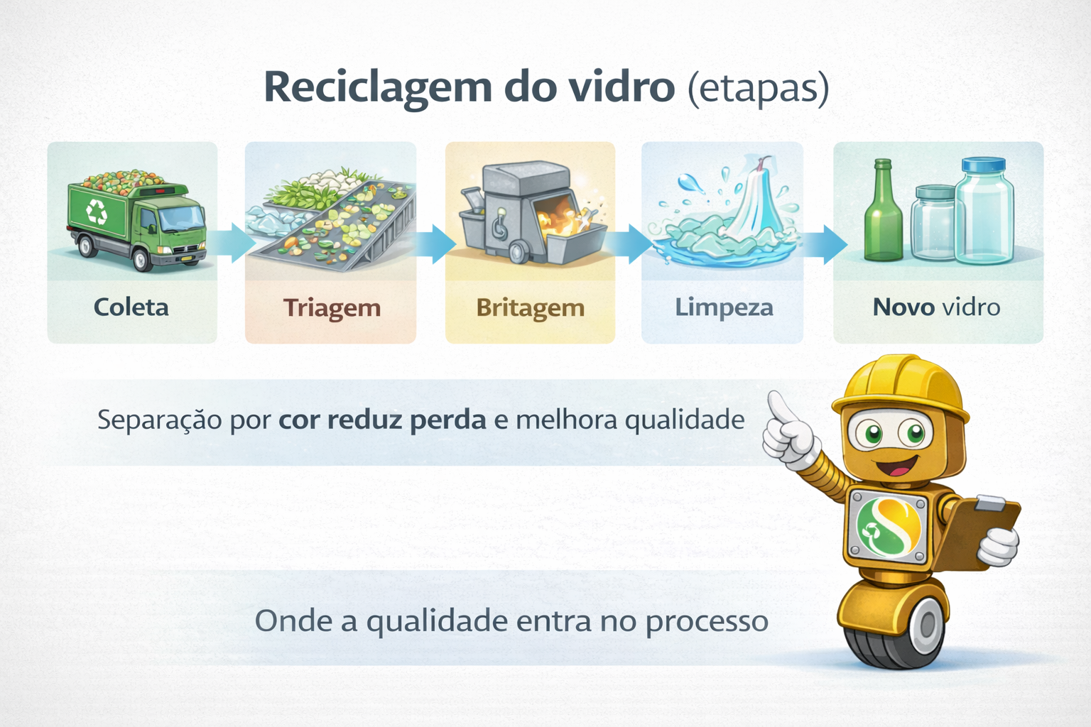 Sim, vidro é muito reciclável, mas com um detalhe importante: quem decide a qualidade é a triagem. O que a indústria quer receber é um caco limpo, sem mistura e com contaminação controlada.