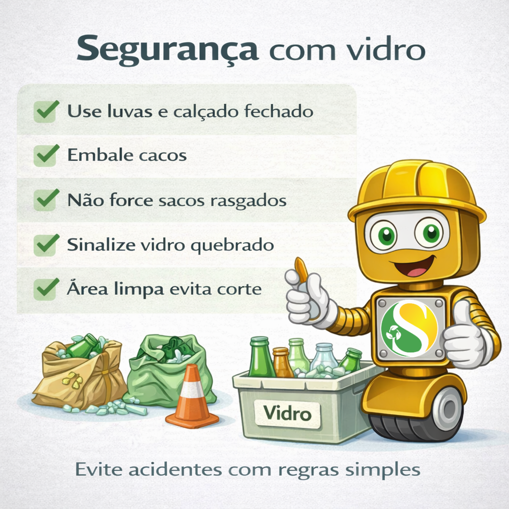 No pátio, em casa ou na coleta, vidro pede respeito. A meta é simples: reduzir risco ao máximo.