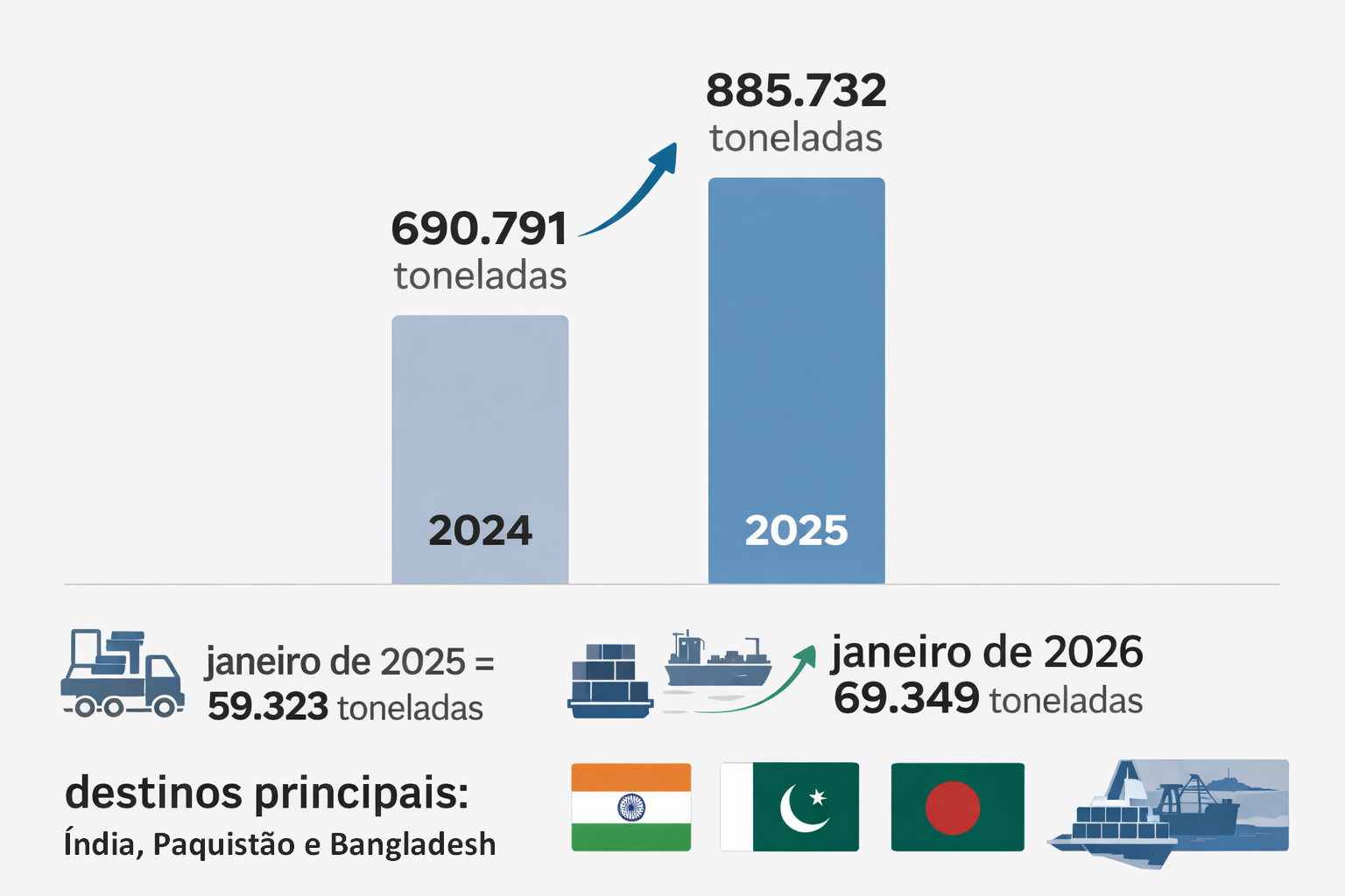Segundo dados da Secretaria de Comércio Exterior (Secex) do Ministério da Economia, repercutidos por Revista Grandes Construções, Papo de Inox, Enfoque, Siderurgia Brasil e Coisas de Agora, o Brasil exportou 69.349 toneladas de sucata ferrosa em janeiro de 2026, alta de 16,9% sobre janeiro de 2025, quando foram embarcadas 59.323 toneladas. O número reforça uma tendência que já vinha se consolidando no fim do ano passado.